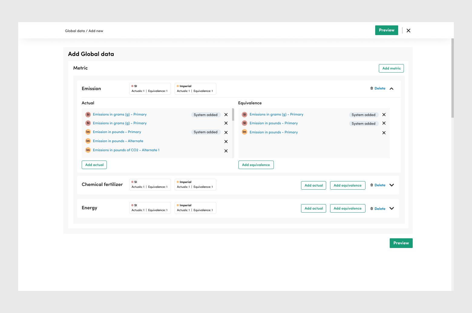Note: GS provides default actuals and equivalences for each metric. You can add as many actuals and equivalences of you choice for each metric, although there must be atleast 1 actual and equivalence for each measurement system configured. The last available actual and equivalence for each measurement system cannot be deleted.